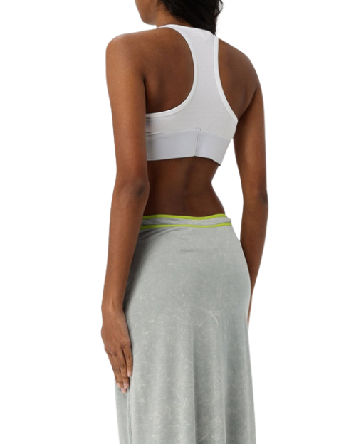 Αυτό το γυναικείο αθλητικό σουτιέν είναι κατασκευασμένο από απαλό, ελαστικό βαμβάκι με αθλητικό κόψιμο στο πίσω μέρος. Η μεγάλη ζακάρ ζώνη στη μέση διαθέτει κεντρικό κομμένο λογότυπο.